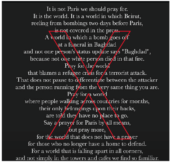 The Pray for Paris movement was not put forth to leave others out. It was an organic and sincere response meant to illustrate support and spread love for those suffering loss.
